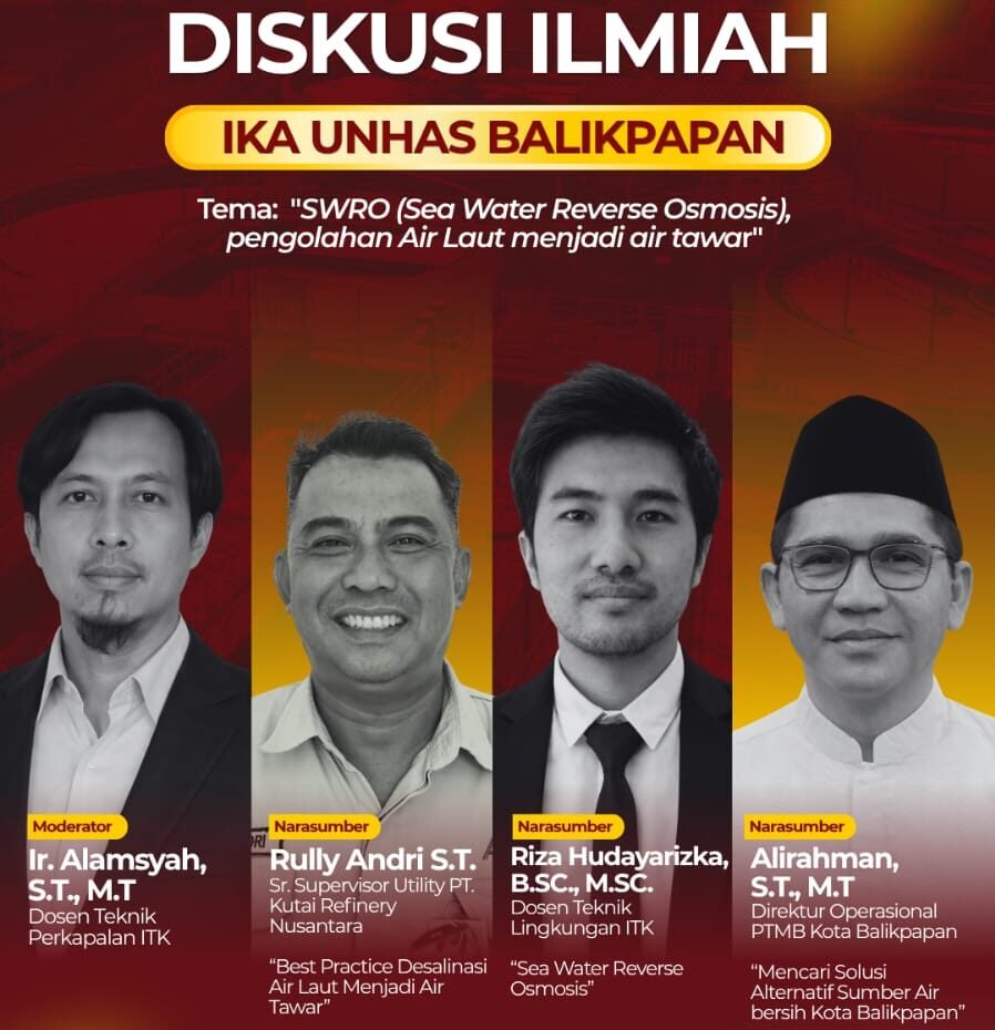 Kegiatan ini dijadwalkan berlangsung pada Sabtu, 18 April 2026, mulai pukul 09.00 Wita di Hotel Pacific Balikpapan, dan dikemas dalam rangkaian Halal Bihalal alumni. Dengan mengusung tema Seawater Reverse Osmosis (SWRO), forum ini akan membahas teknologi pengolahan air laut menjadi air tawar sebagai salah satu alternatif pemenuhan kebutuhan air bersih, khususnya di wilayah pesisir seperti Balikpapan.